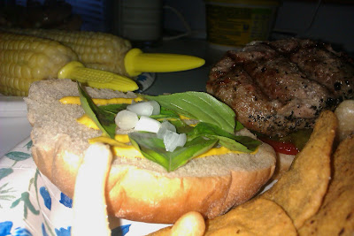 Dinner tonight was turkey burgers with fresh basil and onions from the garden. Mmmm, yum. Basil is good on turkey burgers. Oh and they aren't just any turkey burgers - they were juicy lucy's. For my relatives not from the Cities - a juicy lucy is burger stuffed with cheese. I used garlic herb Laughing Cow cheese (delicious and low fat). Served tonight with a side of sweet corn, sweet potato chips and Trader Joe's low calorie "fry chips".